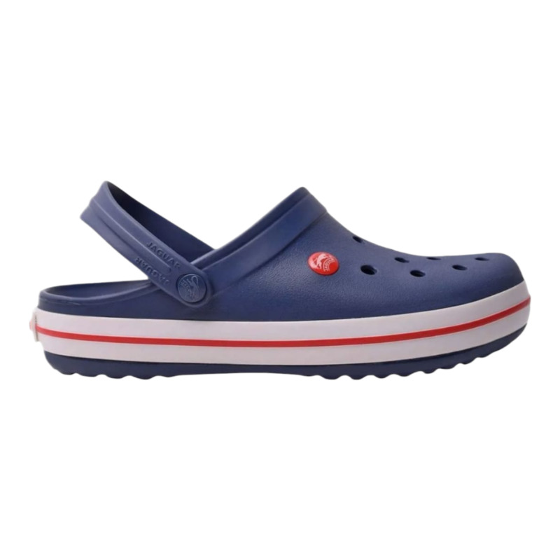 Zueco Jaguar ergonómico con perforaciones para ventilación y tira trasera móvil. Material liviano, flexible y resistente al agua. Perfecto para uso casual, playa o jardín.