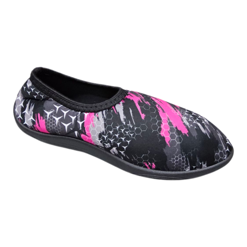 Pantufla Faran modelo 360 con diseo estampado en negro y rosa, flexible y confortable.